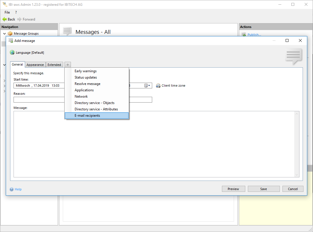 In this tab the recipients for the e-mail delivery can be managed. Both individual e-mail addresses and groups can be used as e-mail recipients.