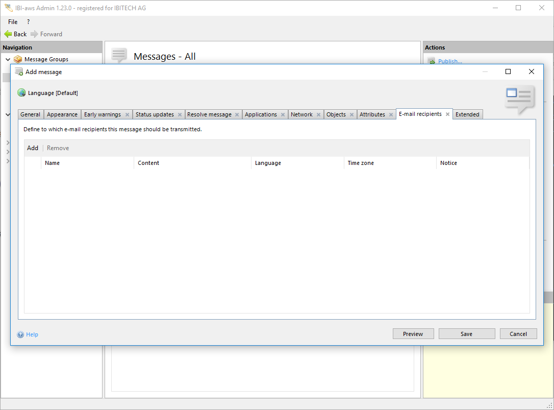 Use the buttons above the table to add or remove e-mail recipients. To add e-mail recipients, they must first be defined in the E-mail Pool.