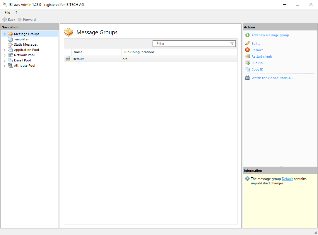The navigation panel is on the left-hand side and gives access to the message groups, templates, static messages, applications pool, network pool, e-mail pool and the attribute pool.