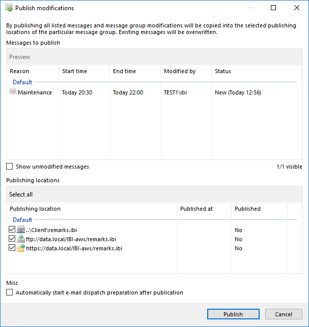 After clicking on Publish an overview of all messages to be published appears. By default only messages that have been changed since the last publication will be displayed in the overview. If required, unchanged messages can be displayed by checking the Show Unchanged Messages check box.