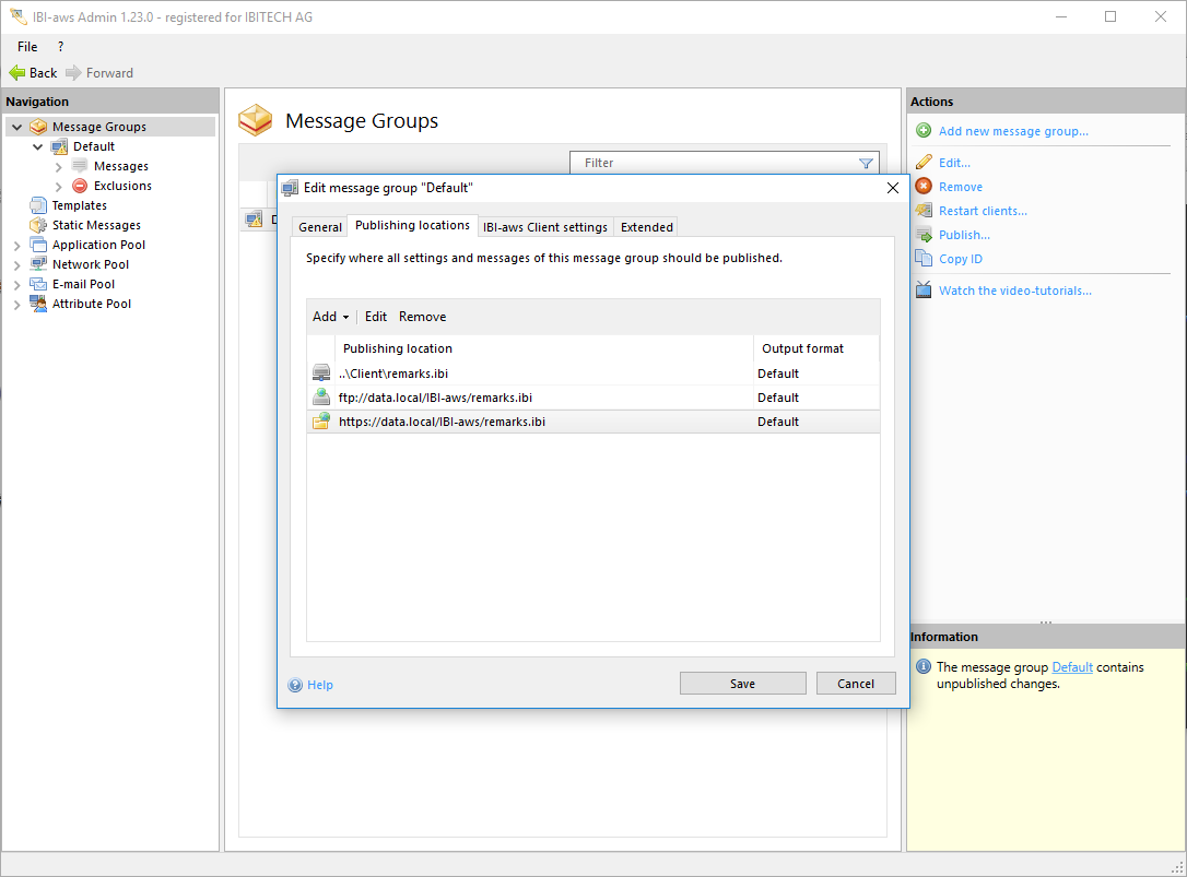 The publishing location can be anywhere as long as IBI-aws Clients are able to later access the generated message file stored there. If a message file is not stored in the same directory as the IBI.aws.Client.exe or if it is not named remarks.ibi, the IBI-aws Clients must be configured accordingly (with a start parameter).