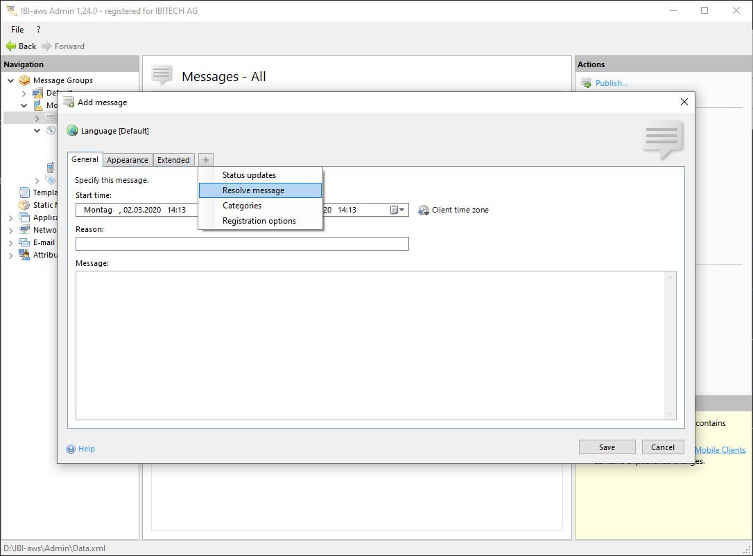 A resolve message serves to inform all message recipients about the resolve of the information (e.g. incident) that has been transported by the message. The resolve message will only be displayed to users that have seen the original message before. The display duration specifies how long the resolve message should be valid after the message' end time.