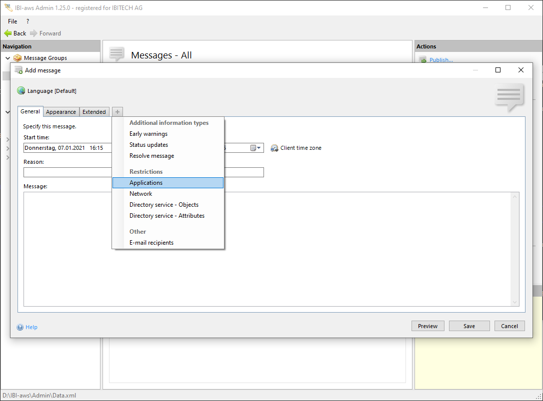 An application or an application group can be added by clicking the Add button. If an application or application group is not yet in the list, it can be added by clicking on the New button. The application or application group added in this manner is stored in the central Application Pool and is therefore available to all messages.