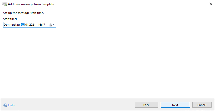 After selecting the right template, the start time must be specified. The starting time specified is used to preserve the duration that was set originally. The starting times of any stored early warnings are also updated.