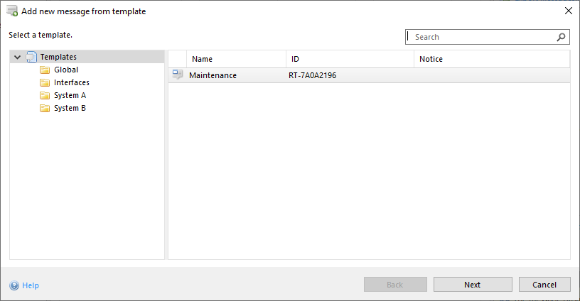 A message can be generated from a template by dragging the desired template from a template folder and dropping it into the message list of a message group.