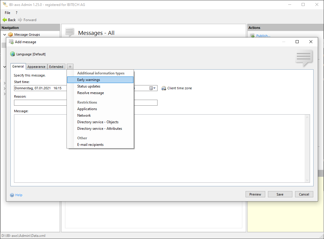 If IBI-aws recognizes an application that is assigned to the message the current warning will be displayed. If IBI-aws recognizes the same application again the warning will be displayed once more. Warnings can be displayed several times. They will be displayed whenever using an application or restarting an application that has been specified as a trigger within the message.