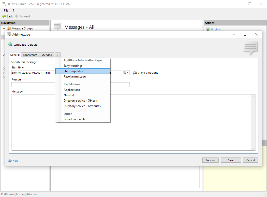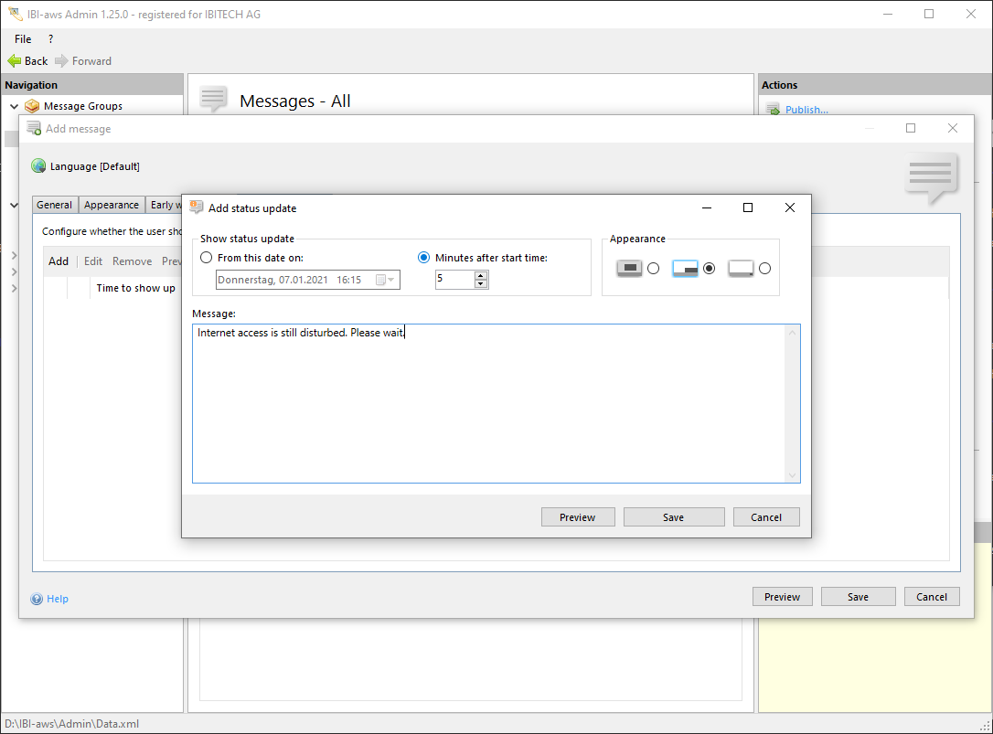 Use status updates to inform users about changed message properties (e.g. end time or message). As of version 1.16 message property changes (e.g. period, message, reason, appearance, etc.) will not cause the message to be displayed again any more.