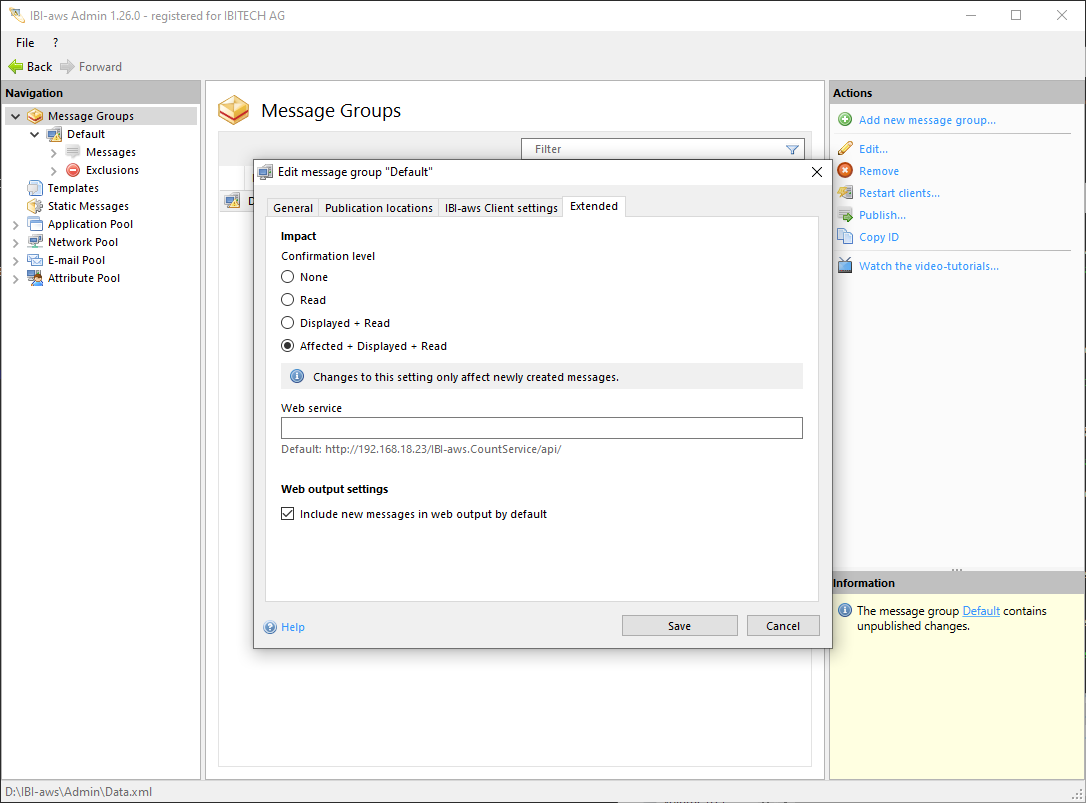Depending on the set confirmation level, each IBI-aws Client transmits corresponding confirmations to the configured web service per message fragment (e.g. message, early warning or resolve message). In the IBI-aws Admin, the corresponding number can then be displayed per confirmation level.