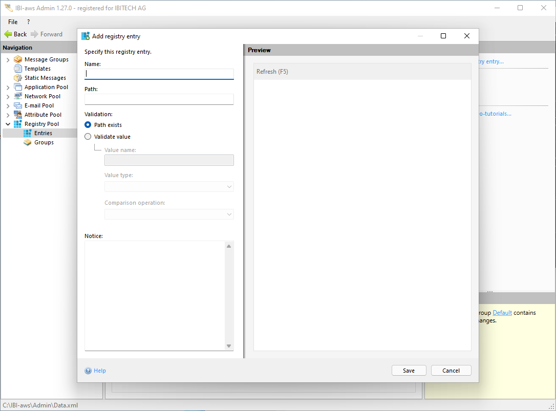 In this field the name of the registry entry is defined, which is only visible within the IBI-aws Admin.
