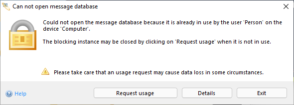 When the message database is blocked by another IBI-aws Admin instance, you have the option to make the blocking IBI-aws Admin user aware of your need to use the message database by clicking Request usage.
