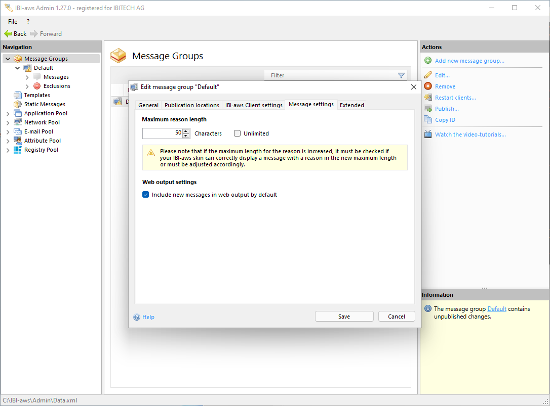If the maximum length is changed, it must be checked whether the IBI-aws Client, or more precisely the IBI-aws Skin used, can correctly display a reason with the newly defined maximum length without errors.