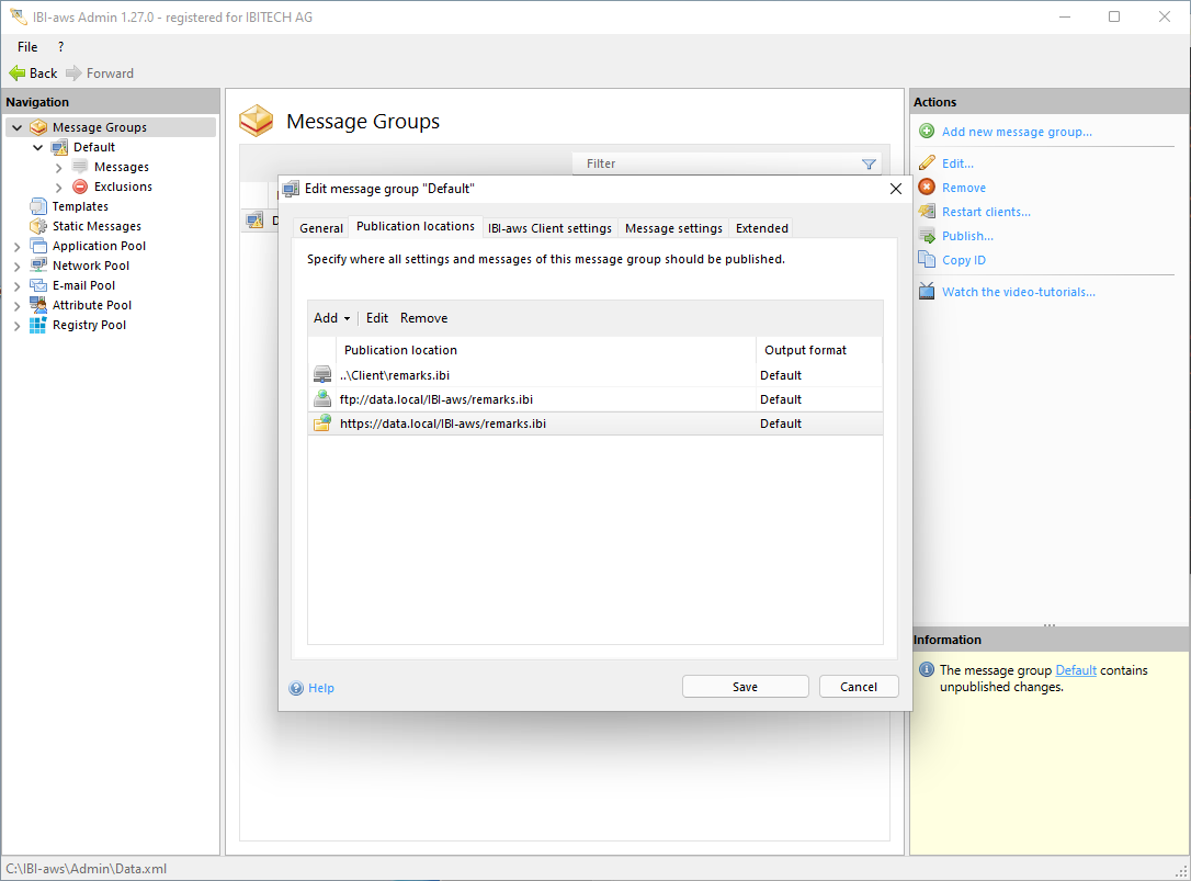 The publishing location can be anywhere as long as IBI-aws Clients are able to later access the generated message file stored there. If a message file is not stored in the same directory as the IBI.aws.Client.exe or if it is not named remarks.ibi, the IBI-aws Clients must be configured accordingly (with a start parameter).