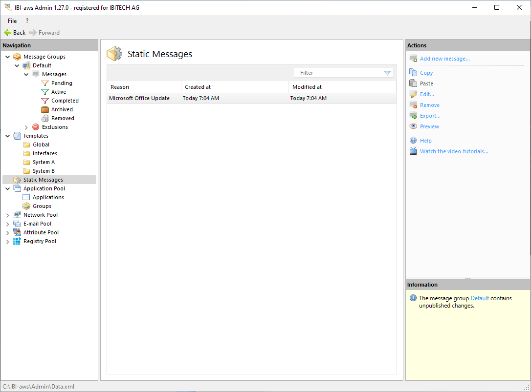 To create a static message, select Static Messages in the Navigation pane. Add new message then appears in the Actions pane.