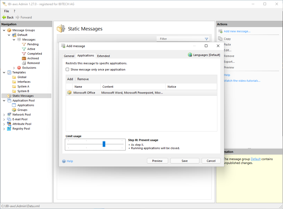 If, during software deployment, users must be notified that an application is not available, a Static Message can be created. A static message has neither a starting nor an ending time; it displays until its IBI-aws Client instance (e.g. from the software deployment application) closes.