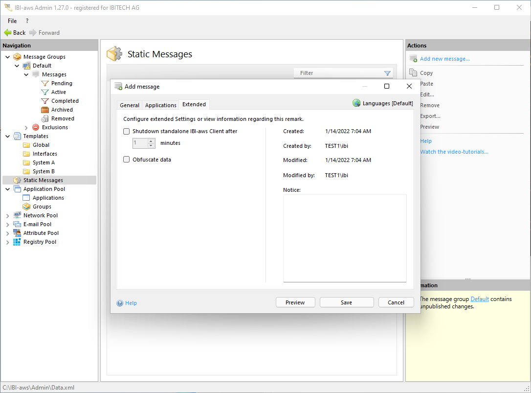 After a static message is created, it is exported to a special message file. This file can then be displayed with an IBI-aws Client instance configured in stand-alone mode.