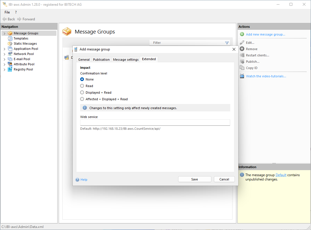 Depending on the set confirmation level, each IBI-aws Client transmits corresponding confirmations to the configured web service per message fragment (e.g. message, early warning or resolve message). In the IBI-aws Admin, the corresponding number can then be displayed per confirmation level.