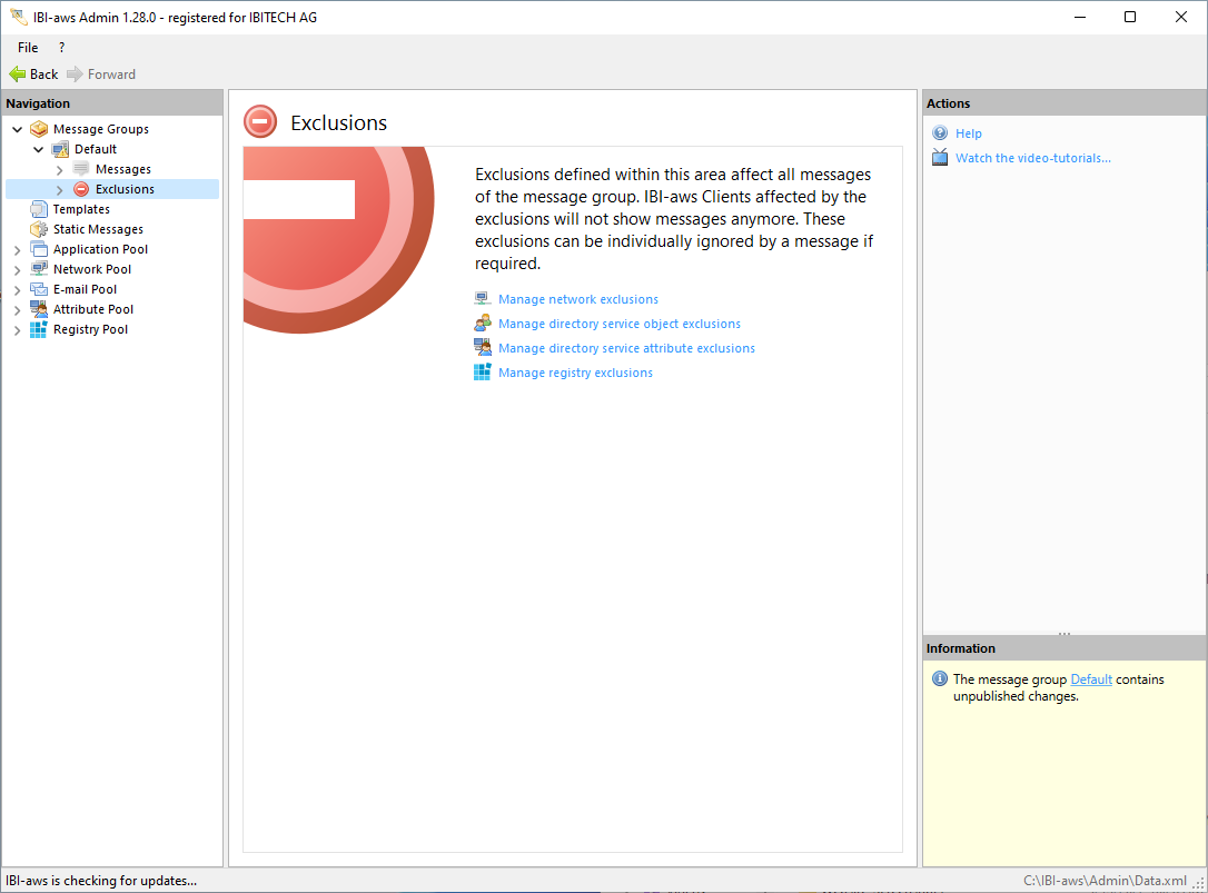 Exclusions have been introduced in order to prevent information transmission via IBI-aws messages to certain users or computers. Exclusions deposited in this area are valid for every message within a message group. No further messages will then be displayed on the corresponding Clients. If needed, individual messages may ignore these exclusions.