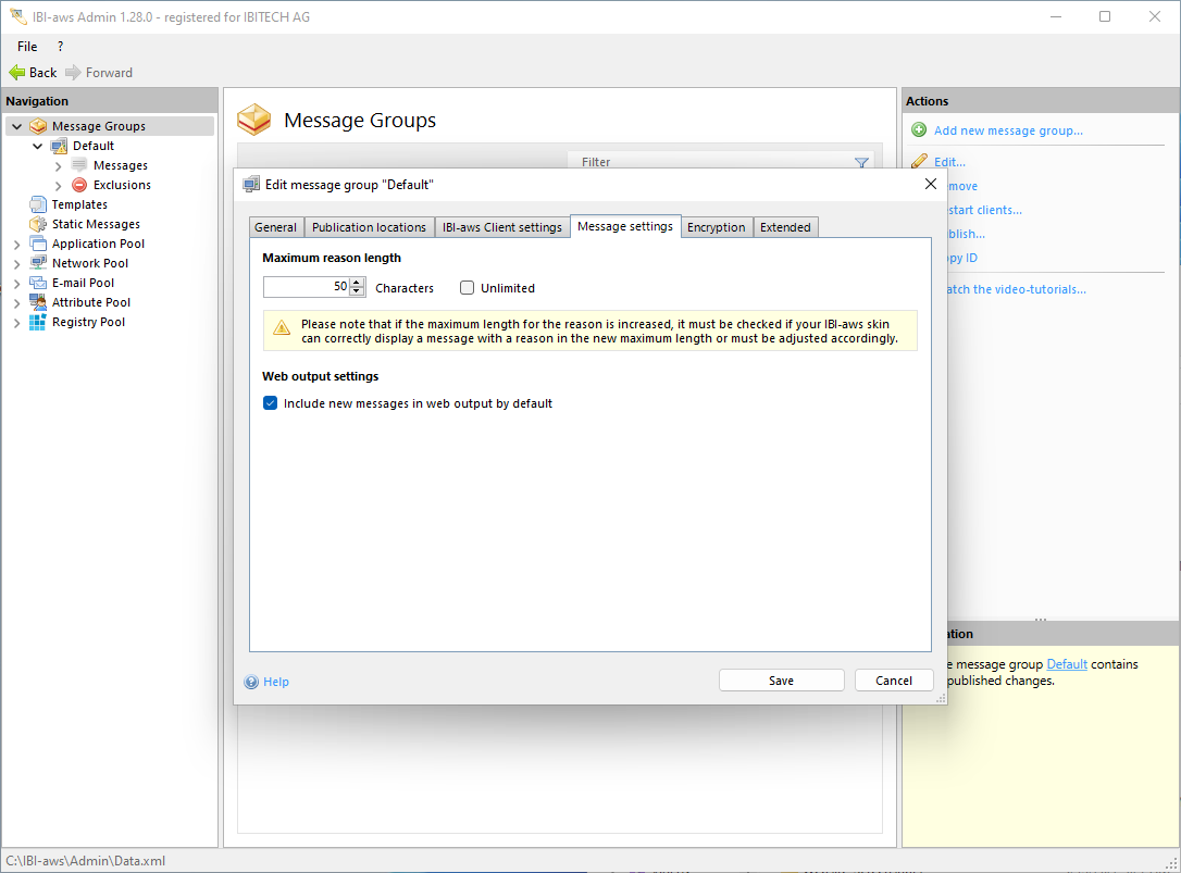 If the maximum length is changed, it must be checked whether the IBI-aws Client, or more precisely the IBI-aws Skin used, can correctly display a reason with the newly defined maximum length without errors.
