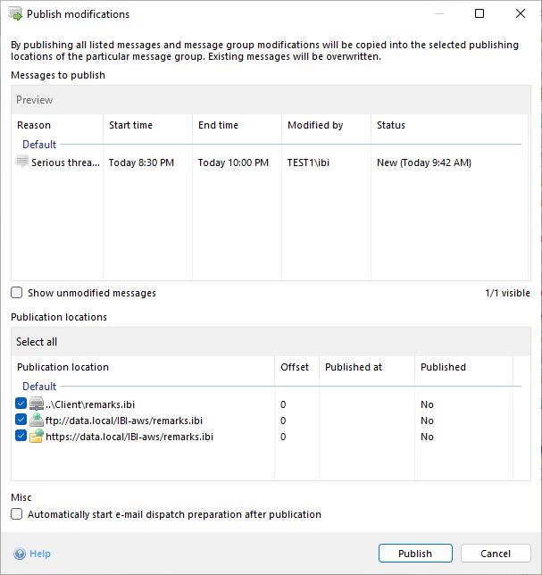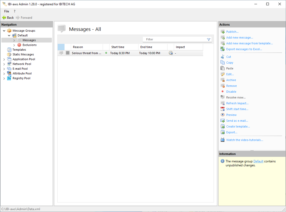 In case a message has been modified or a Pool entry has been edited or message group settings have been changed, it requires that these changes will be communicated to all affected IBI-aws Clients. This is done by clicking on Publish. If a message group contains unpublished changes, a notification will appear in the Information box in the lower right-hand corner.