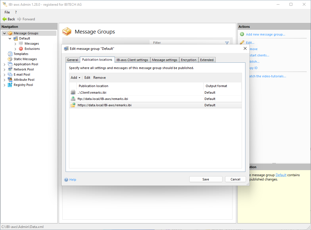 The publishing location can be anywhere as long as IBI-aws Clients are able to later access the generated message file stored there. If a message file is not stored in the same directory as the IBI.aws.Client.exe or if it is not named remarks.ibi, the IBI-aws Clients must be configured accordingly (with a start parameter).