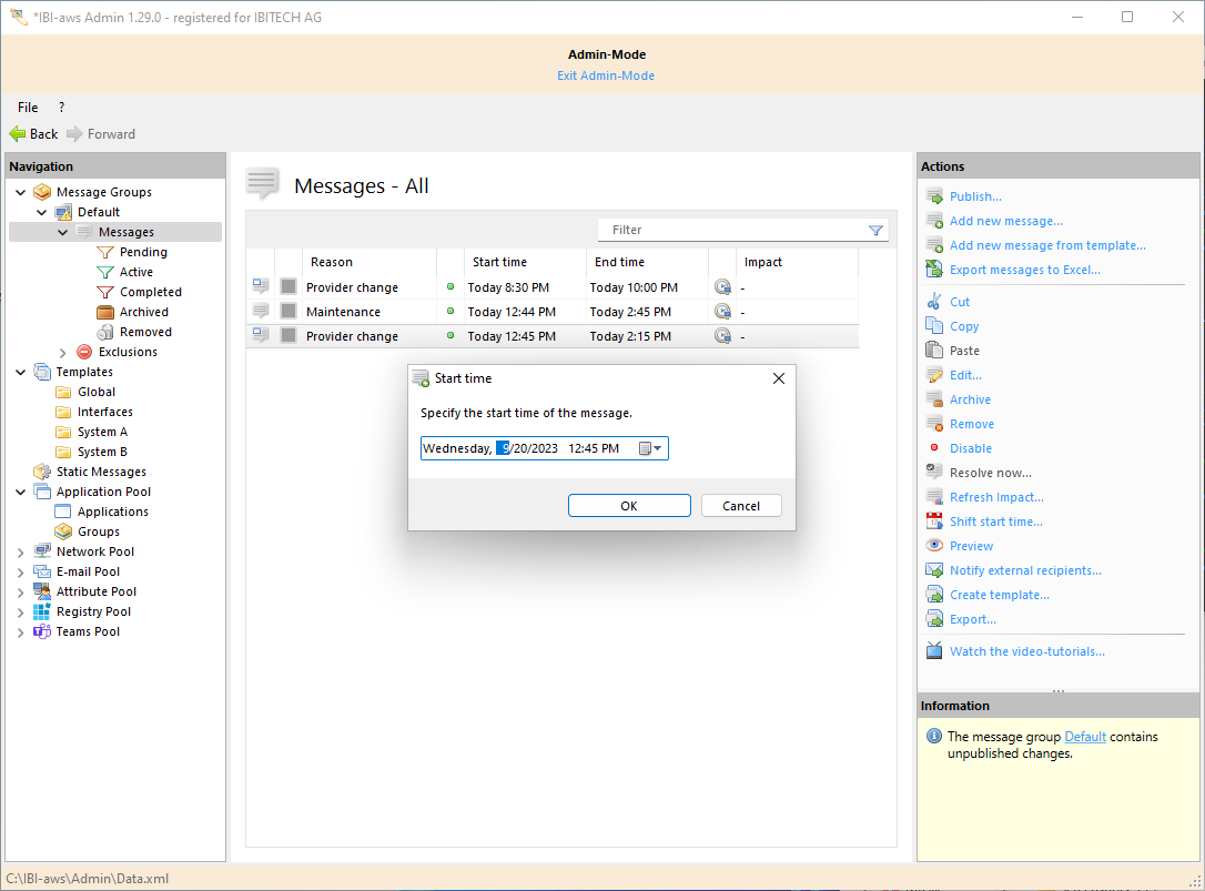 After selecting the right template, the start time must be specified. The starting time specified is used to preserve the duration that was set originally. The starting times of any stored early warnings are also updated.