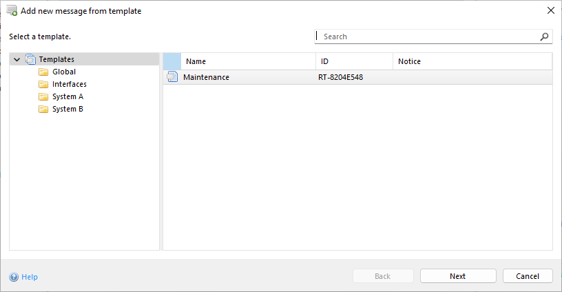 A message can be generated from a template by dragging the desired template from a template folder and dropping it into the message list of a message group.