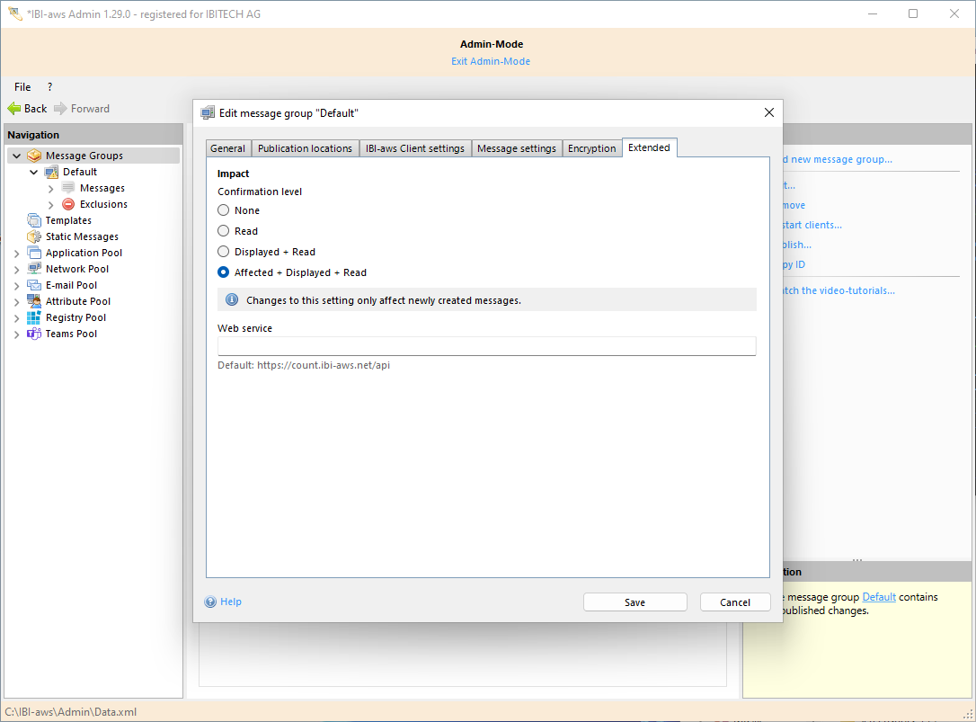 Depending on the set confirmation level, each IBI-aws Client transmits corresponding confirmations to the configured web service per message fragment (e.g. message, early warning or resolve message). In the IBI-aws Admin, the corresponding number can then be displayed per confirmation level.