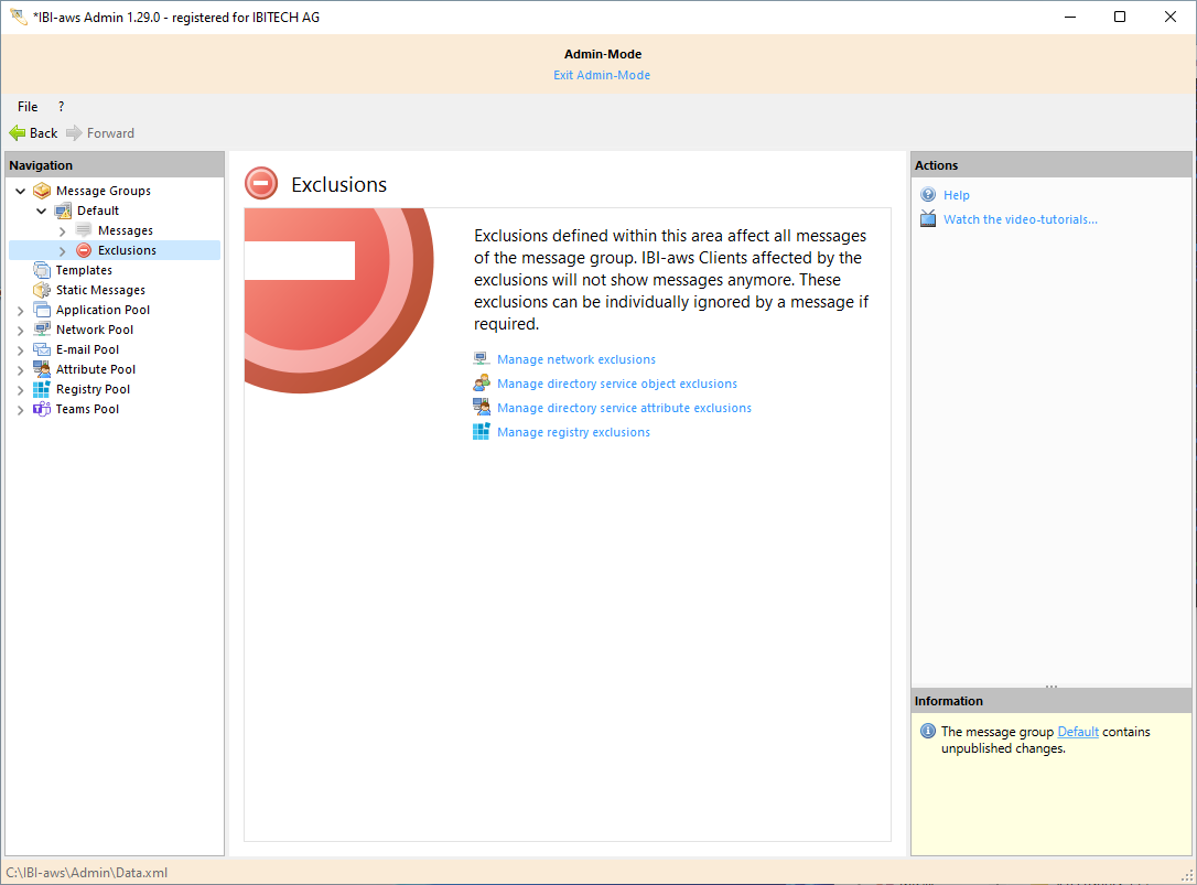 Exclusions have been introduced in order to prevent information transmission via IBI-aws messages to certain users or computers. Exclusions deposited in this area are valid for every message within a message group. No further messages will then be displayed on the corresponding Clients. If needed, individual messages may ignore these exclusions.