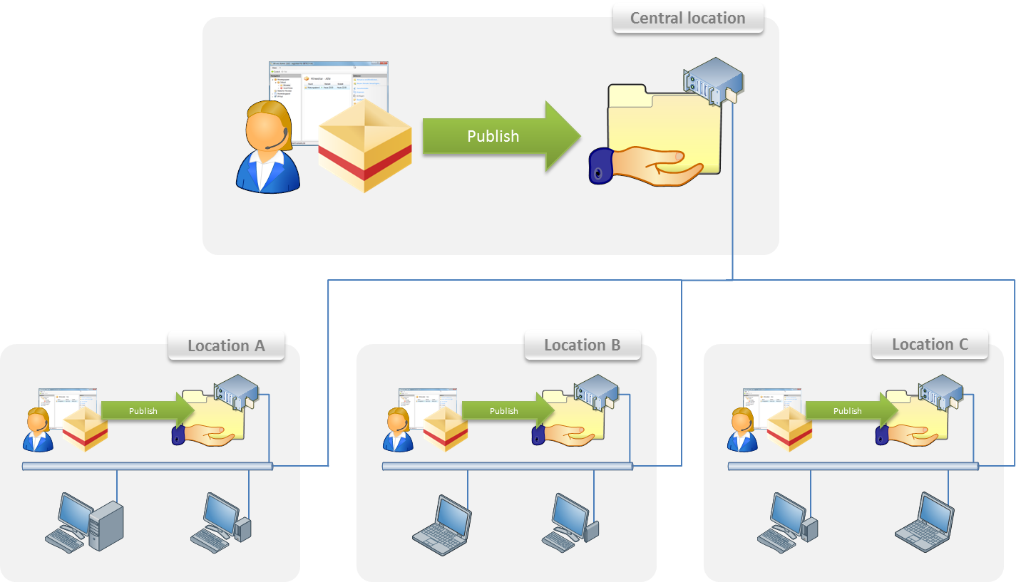 - Each location has its own IBI-aws installation with an own IBI-aws Admin and a specific share.