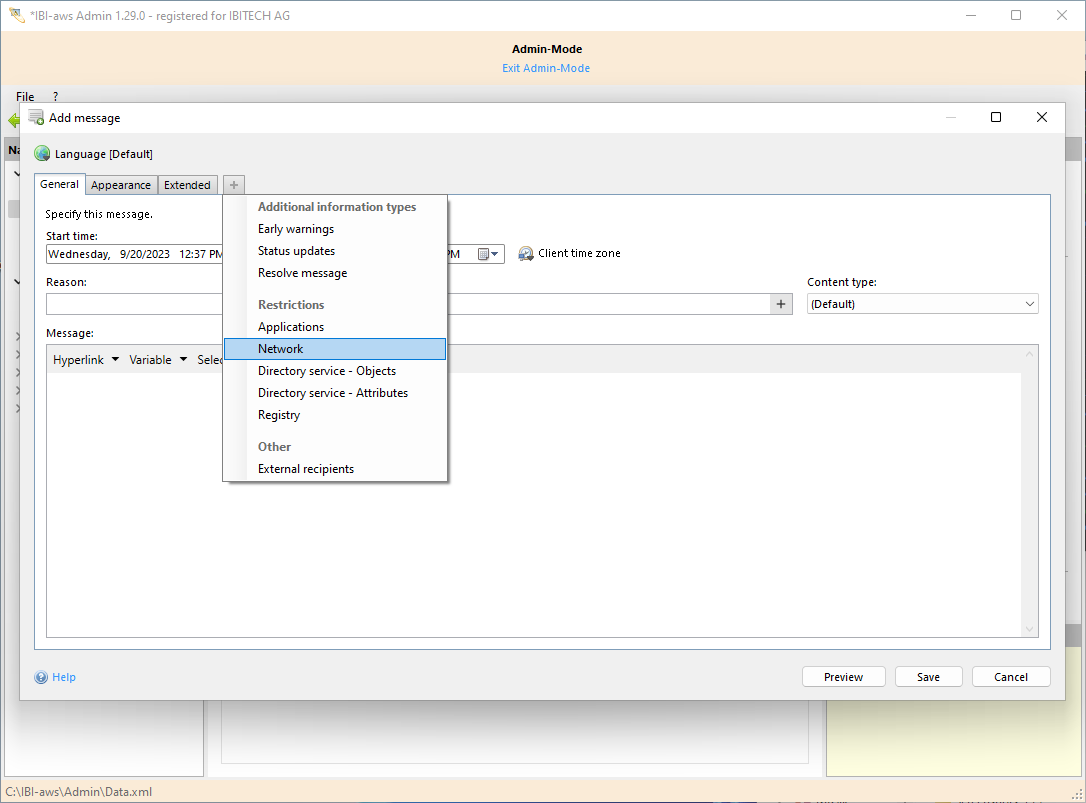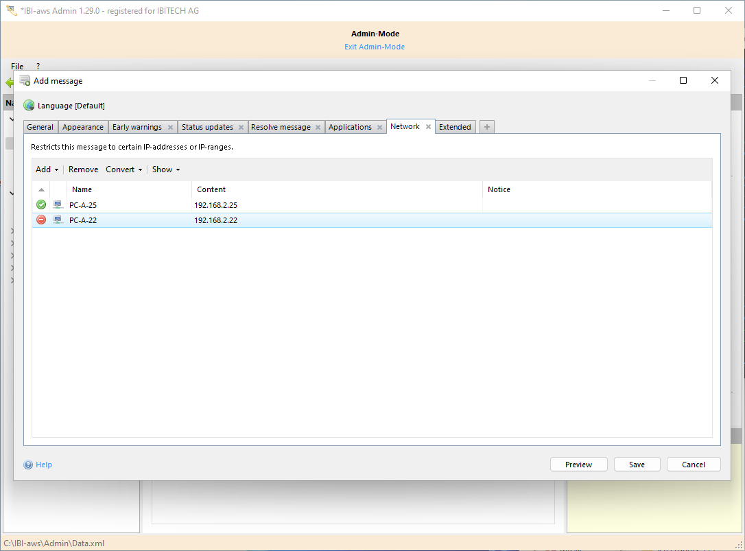This tab lets you specify whether a message is valid only for specific IP addresses or IP ranges. Exclusions of specific IP addresses or IP ranges can also be set.