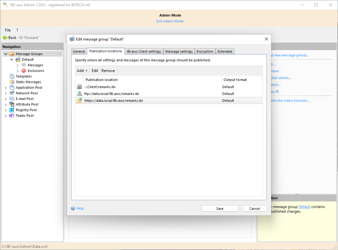The publishing location can be anywhere as long as IBI-aws Clients are able to later access the generated message file stored there. If a message file is not stored in the same directory as the IBI.aws.Client.exe or if it is not named remarks.ibi, the IBI-aws Clients must be configured accordingly (with a start parameter).