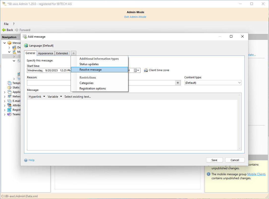 A resolve message serves to inform all message recipients about the resolve of the information (e.g. incident) that has been transported by the message. The resolve message will only be displayed to users that have seen the original message before. The display duration specifies how long the resolve message should be valid after the message' end time.