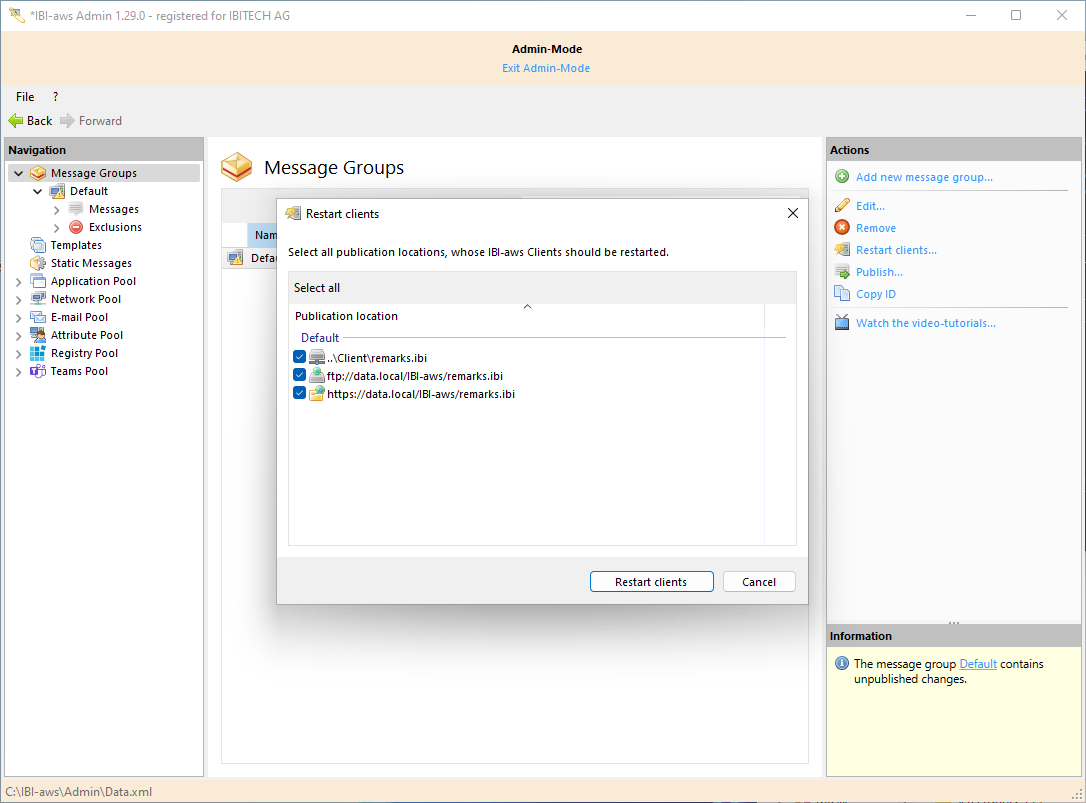 After clicking on Restart Clients, all publishing locations whose IBI-aws Clients need to be restarted must be selected. All publication locations are selected by default. Individual publication locations can be excepted as necessary. Clicking on the Restart Clients button tells all affected IBI-aws Clients to restart. How rapidly the command is processed depends on the synchronization interval setting.