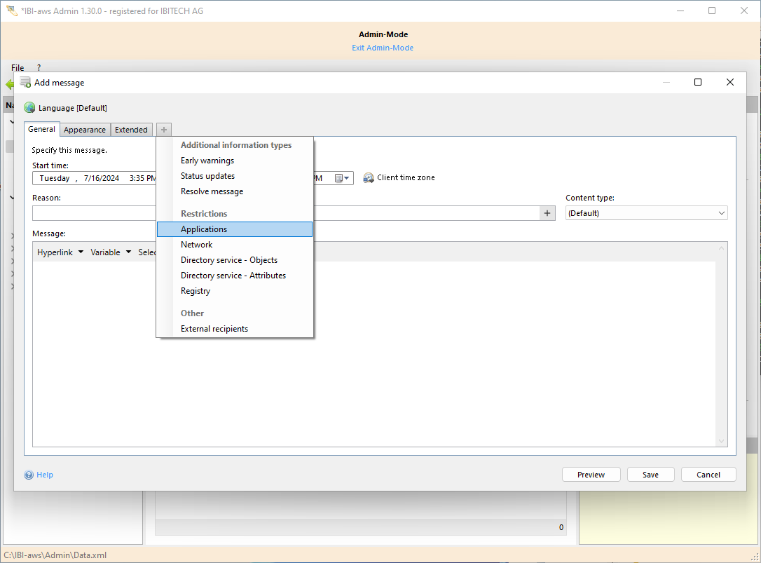 The application specific message is based on the general message but adds the condition Applications. To create an application specific message at least one application has to be determined which will then work as a trigger for the message to be displayed. The message will only be displayed if the computer is executing the predetermined application. This type of message is particularly useful if you wish to restrict the information to users, who are using predetermined applications. Users, who never work with these predetermined applications will not receive unnecessary information.