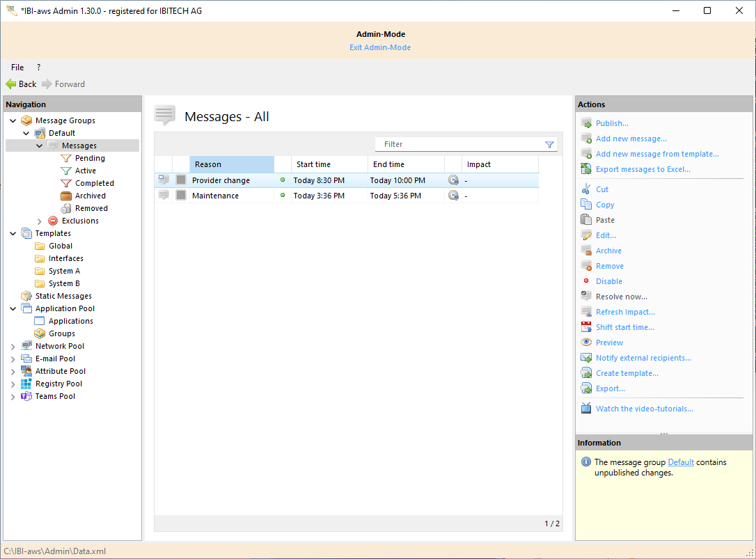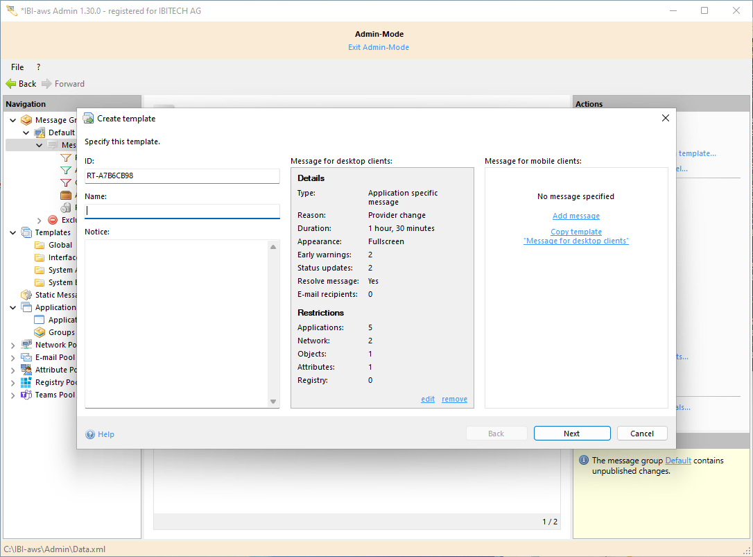 To create a template, in addition to a message for desktop clients and/or a message for mobile clients — which can be added in each case via the link Add Message in the respective box — you will need a unique ID (to simplify locating the template later) and a name. A comment can also be included.