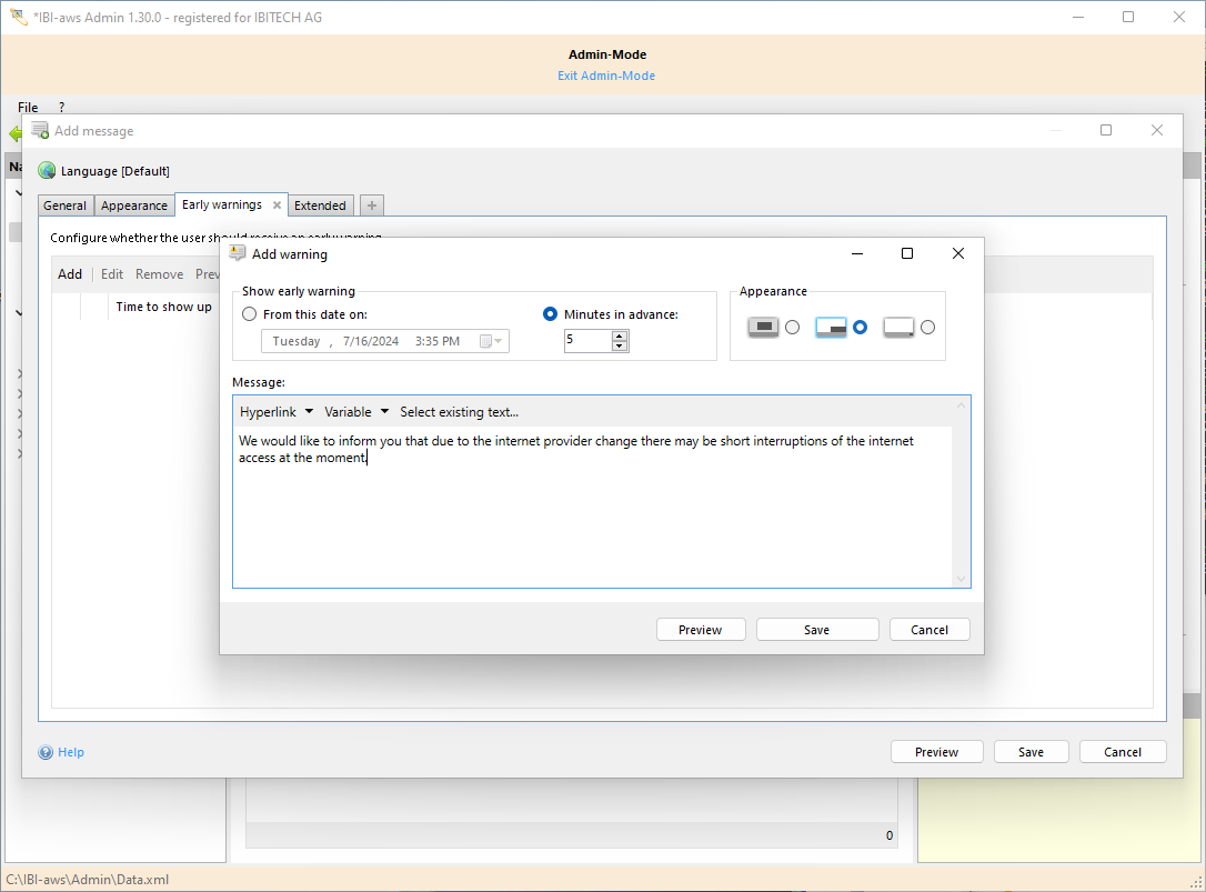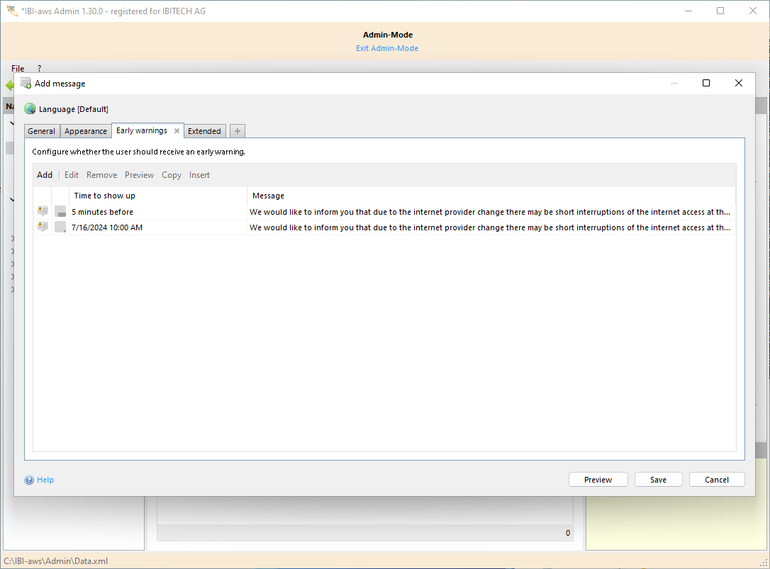 Use this button to view a preview of the early warning like it will be displayed on the user's screen.