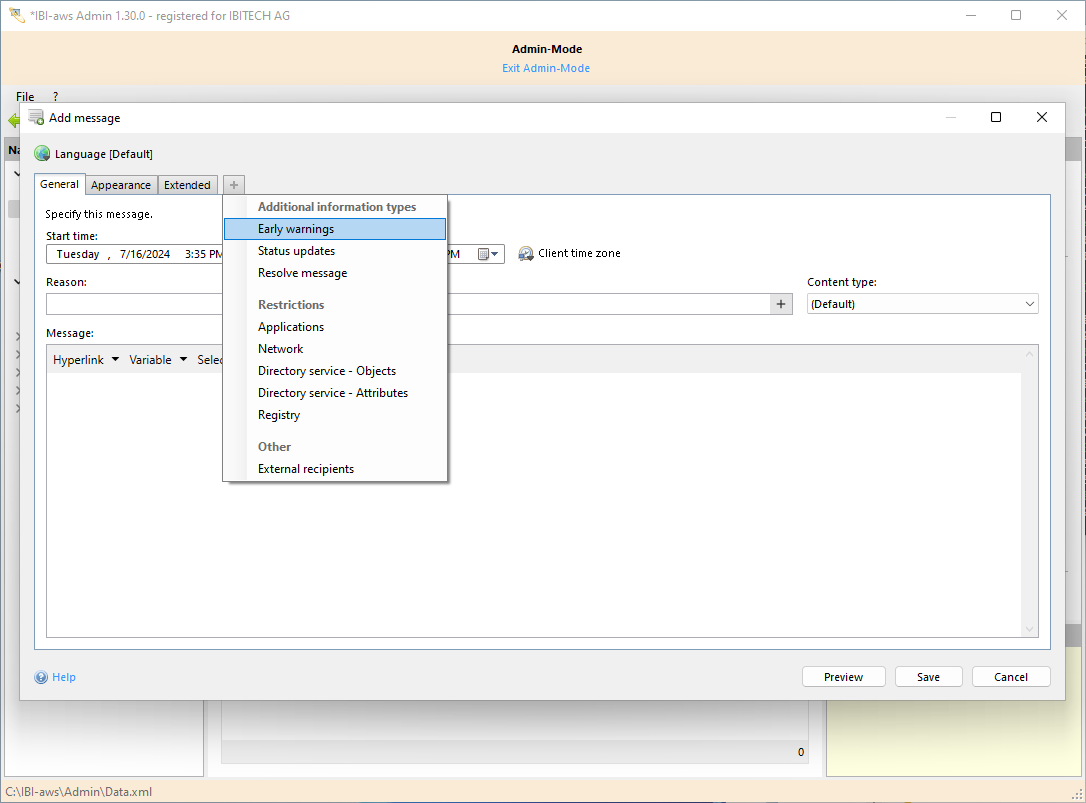If IBI-aws recognizes an application that is assigned to the message the current warning will be displayed. If IBI-aws recognizes the same application again the warning will not be displayed again. Every warning will always be displayed once. They will be displayed if the user uses or starts an application, which has been specified as a trigger within the message.Disabled