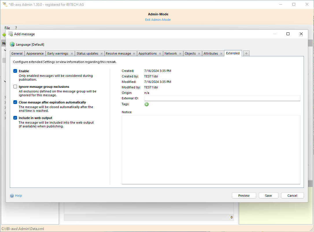 This section contains more settings. In addition, various information about the message are shown. About the note field it is possible to add additional information which are stored directly on the message. These are not visible to the end user.