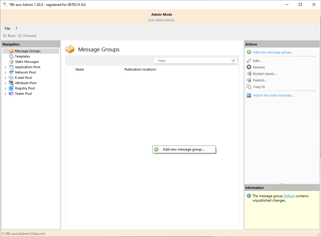The action Add new message group is used to create a new message group. This action appears in the Actions panel when Message Groups is selected in the Navigation panel. This menu item can also be accessed by right clicking in the central Message Groups area.