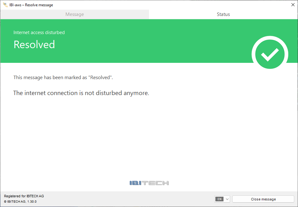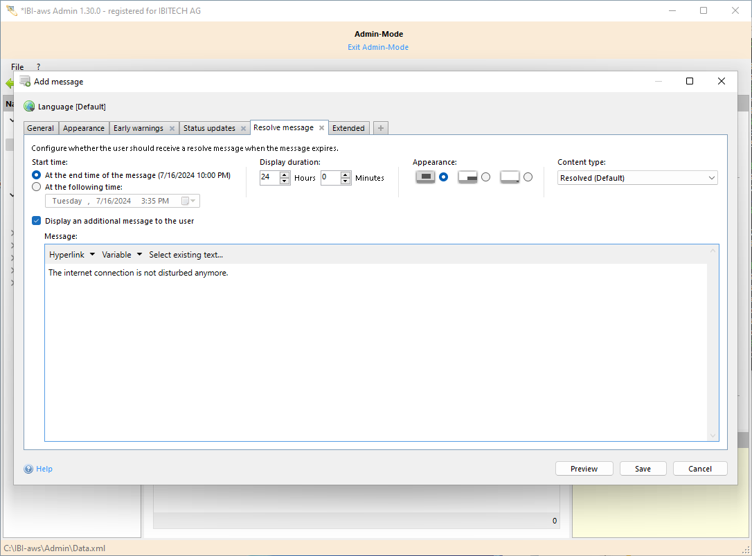 A resolve message serves to inform all message recipients about the resolve of the information (e.g. incident) that has been transported by the original message. The resolve message will only be displayed to users that have seen the original message before. The display duration specifies how long the resolve message should be valid after the message' end time.