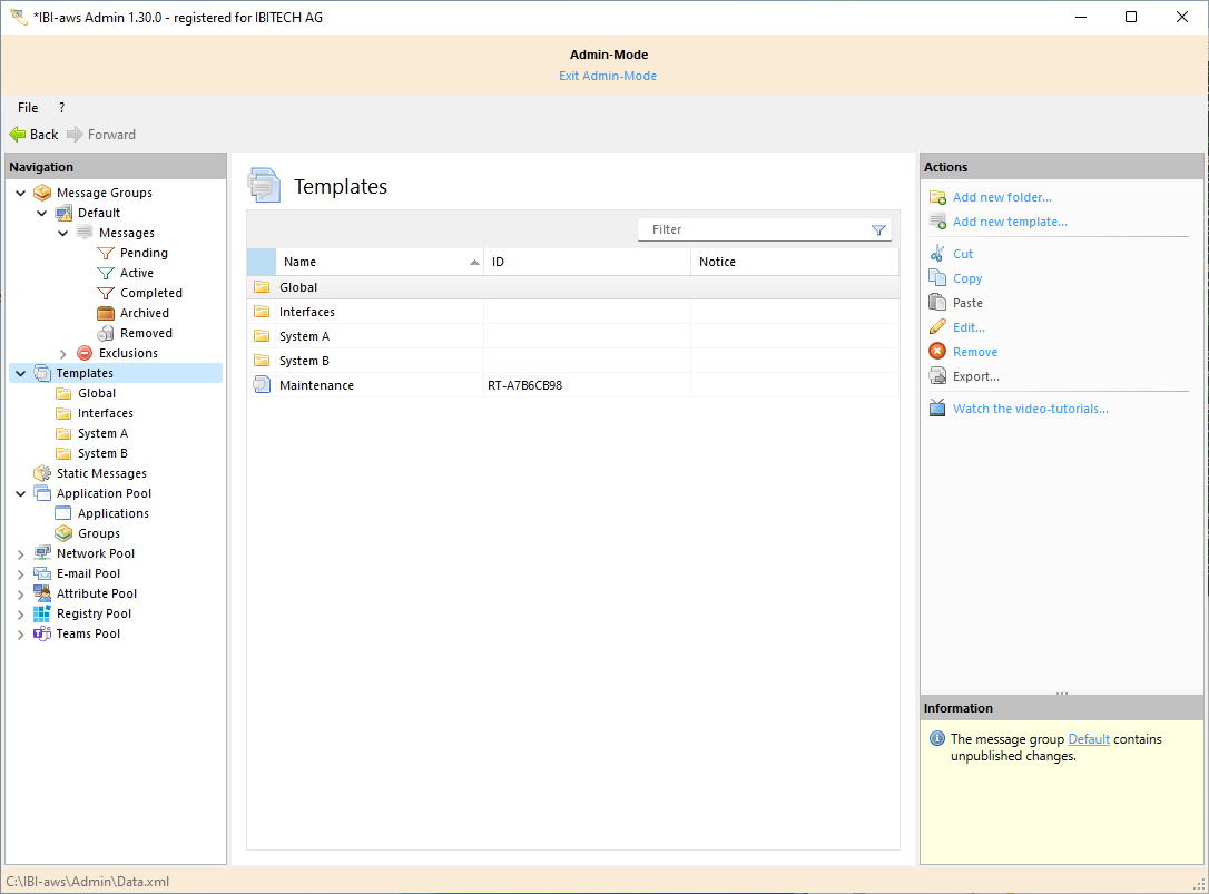 The templates are stored in the section Templates and are available for all message groups. To improve the management of the templates it is possible to store them in subfolders.